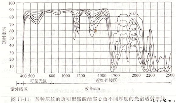 聚碳酸酯耐力板在室溫下的折射率是1.585,圖11-11表明無(wú)色透明聚碳酸酯實(shí)心板不同厚度的光譜透射曲線。板材厚為1.0mm、2.0mm、3.0mm、5.0 mm、6.0mm、8.0mm、10.0mm。圖11-12是3.0mm無(wú)色透明聚碳酸酯實(shí)心板光滑板和壓紋板的不同光譜透射曲線。圖11-13是3.0mm有色透明聚碳酸酯實(shí)心板不同顏色情況下不同的光譜透射曲線。