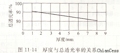 圖11-14表示無(wú)色透明聚碳酸酯 實(shí)心板 的厚度與總透光率的關(guān)系。由此圖看出,例如1mm無(wú)色透明聚碳酸酯實(shí)心板的總透光率為90%,與玻璃的透光率相當(dāng)。